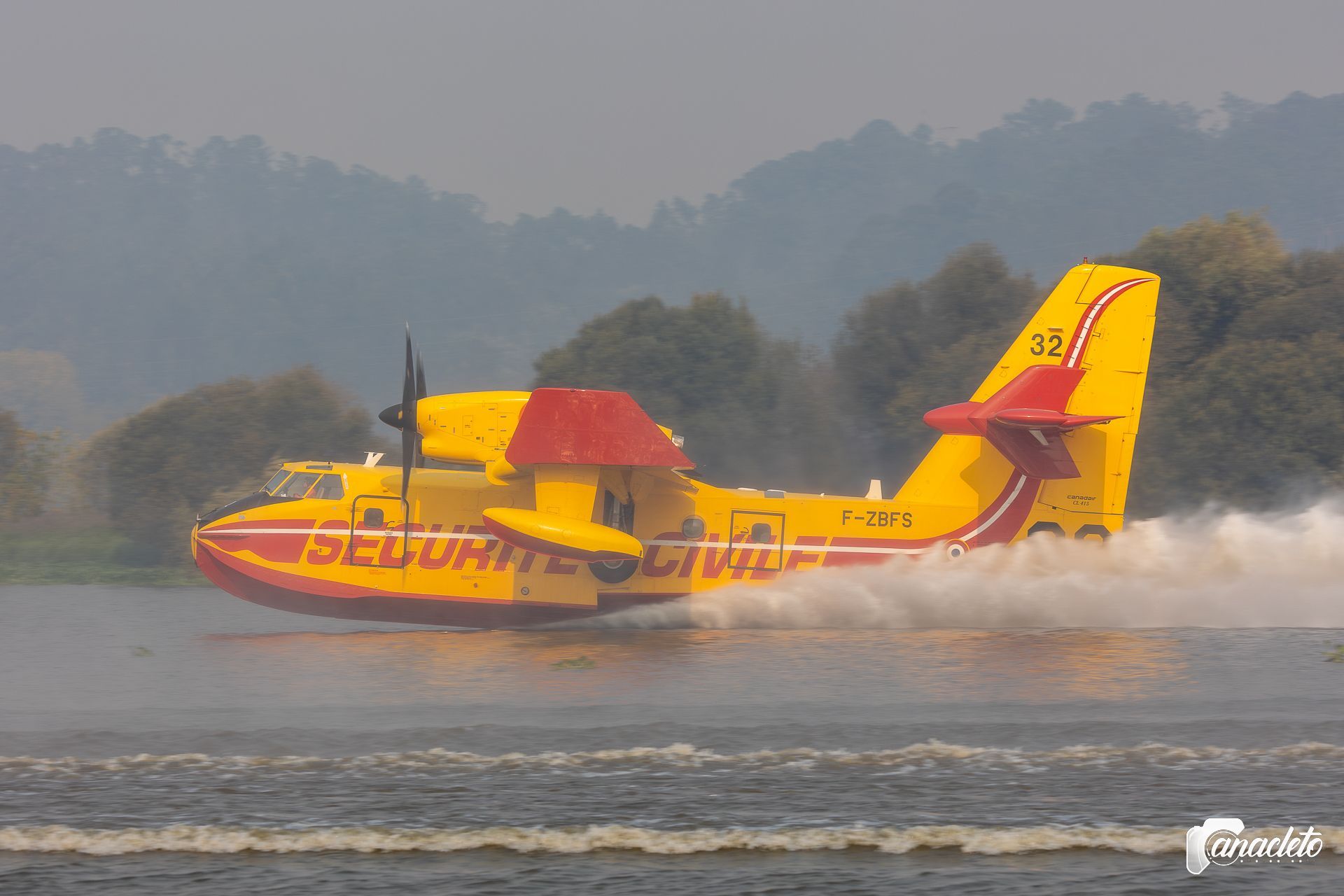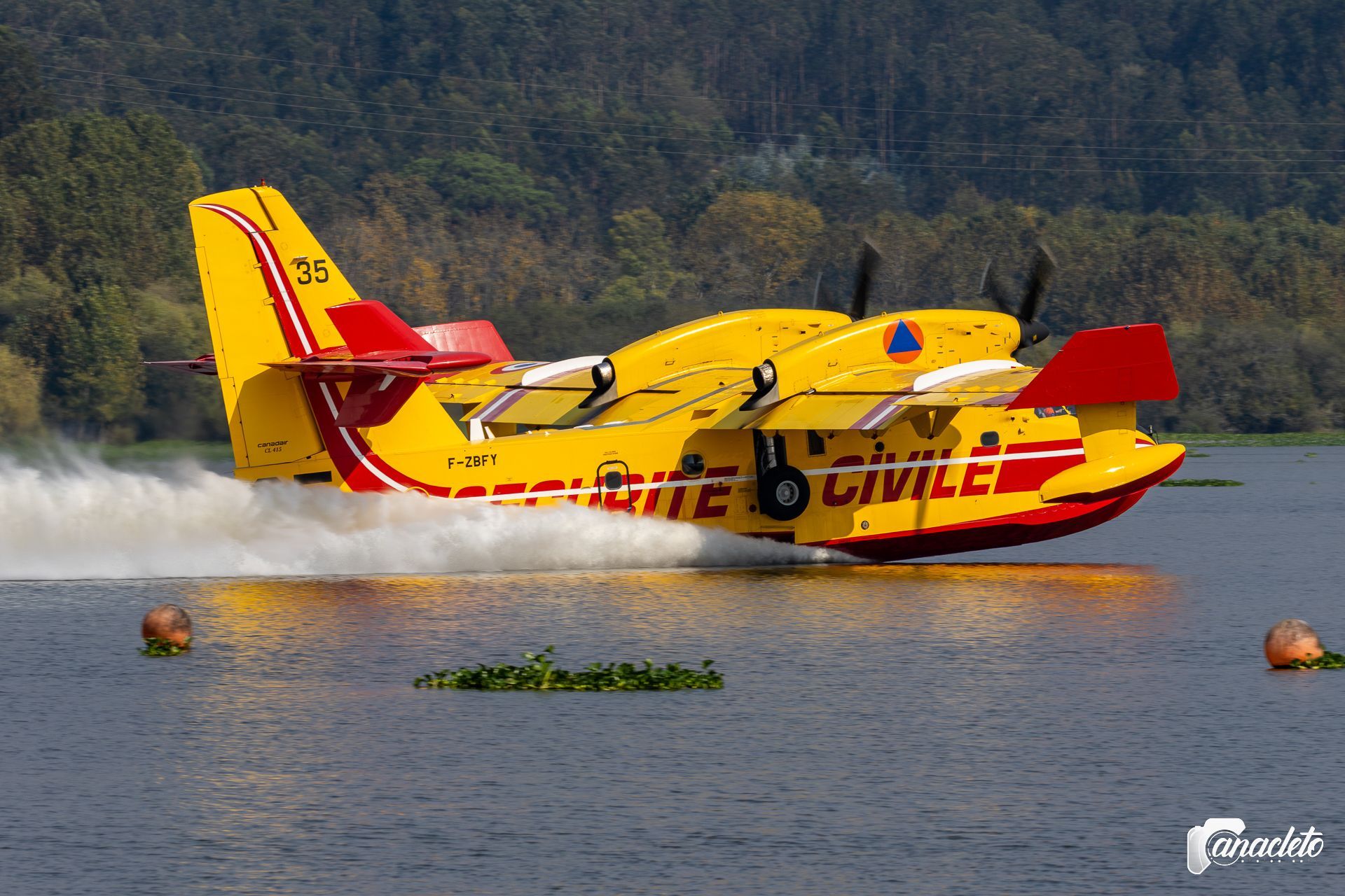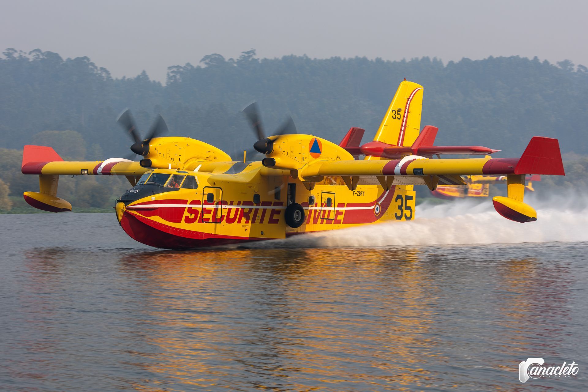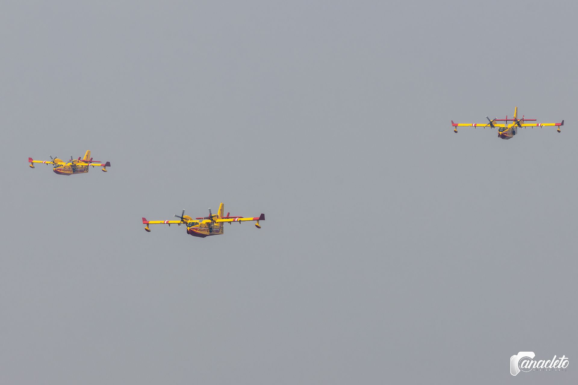 3 of the 4 Canadair CL-415s from Sécurité Civile performing the "scooping" maneuver at Pateira de Fermentelos. These aircraft were deployed in Portugal under the European Union's Civil Protection Mechanism.