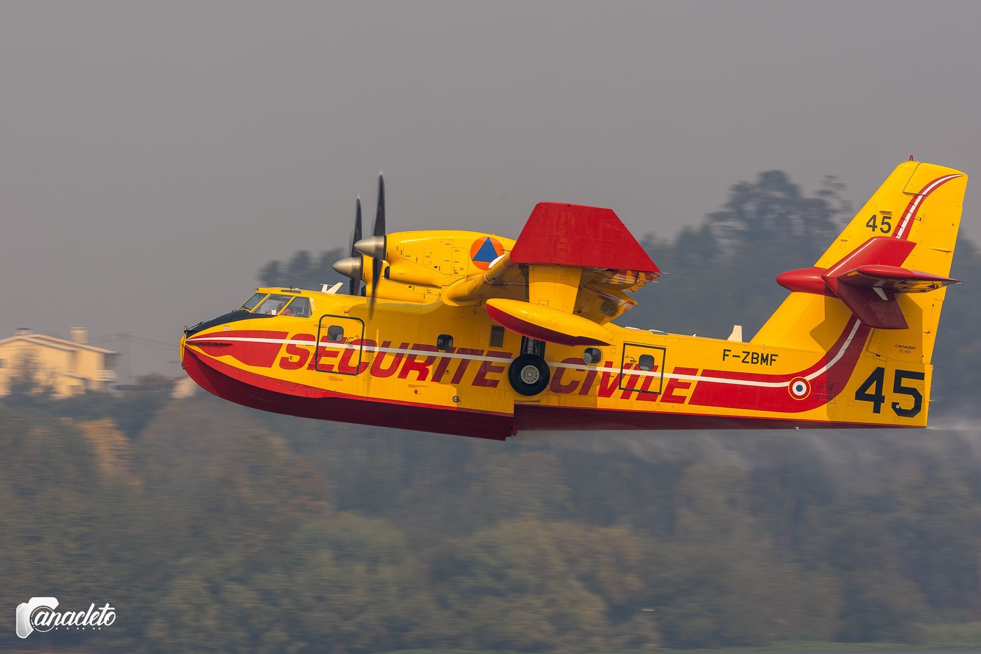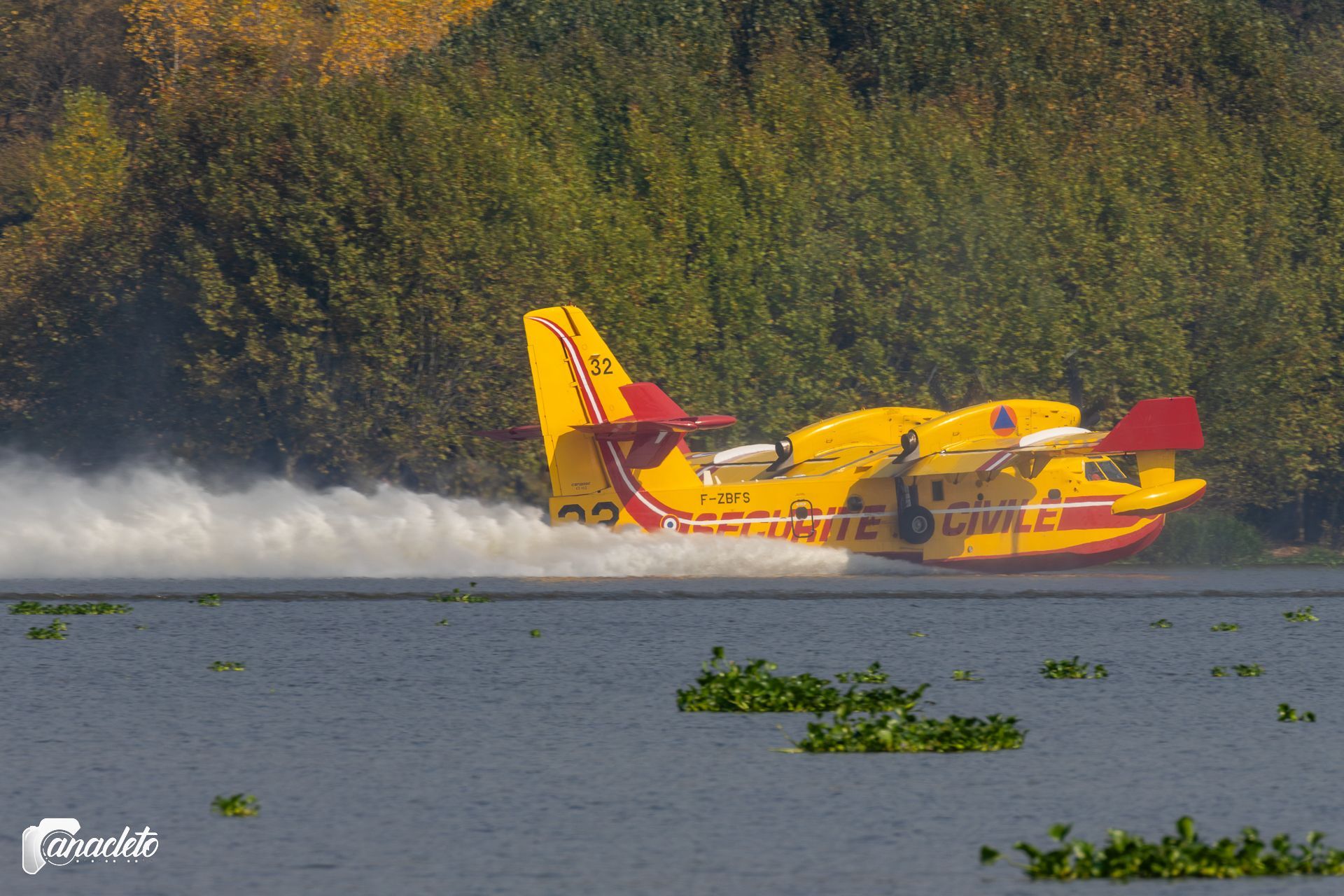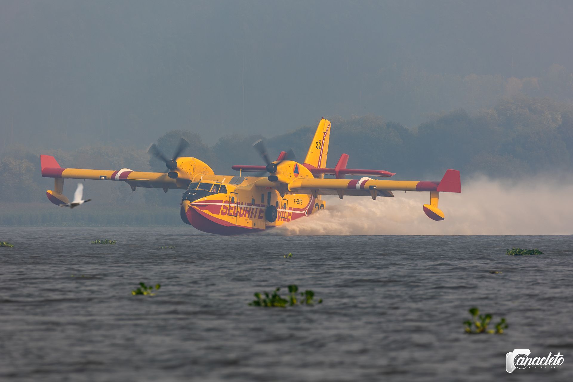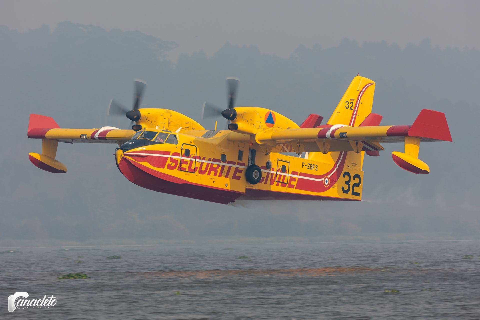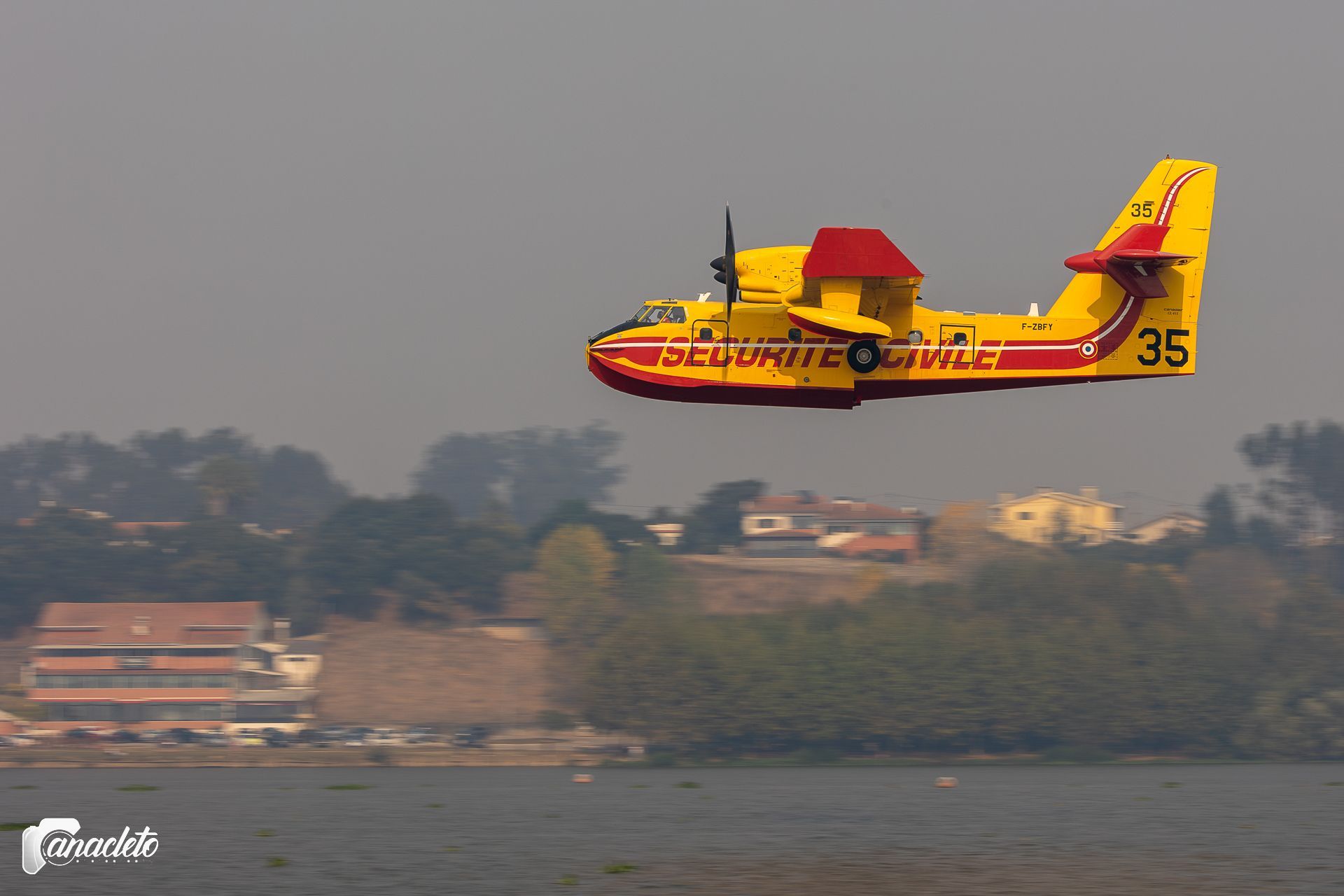 3 of the 4 Canadair CL-415s from Sécurité Civile performing the "scooping" maneuver at Pateira de Fermentelos. These aircraft were deployed in Portugal under the European Union's Civil Protection Mechanism.