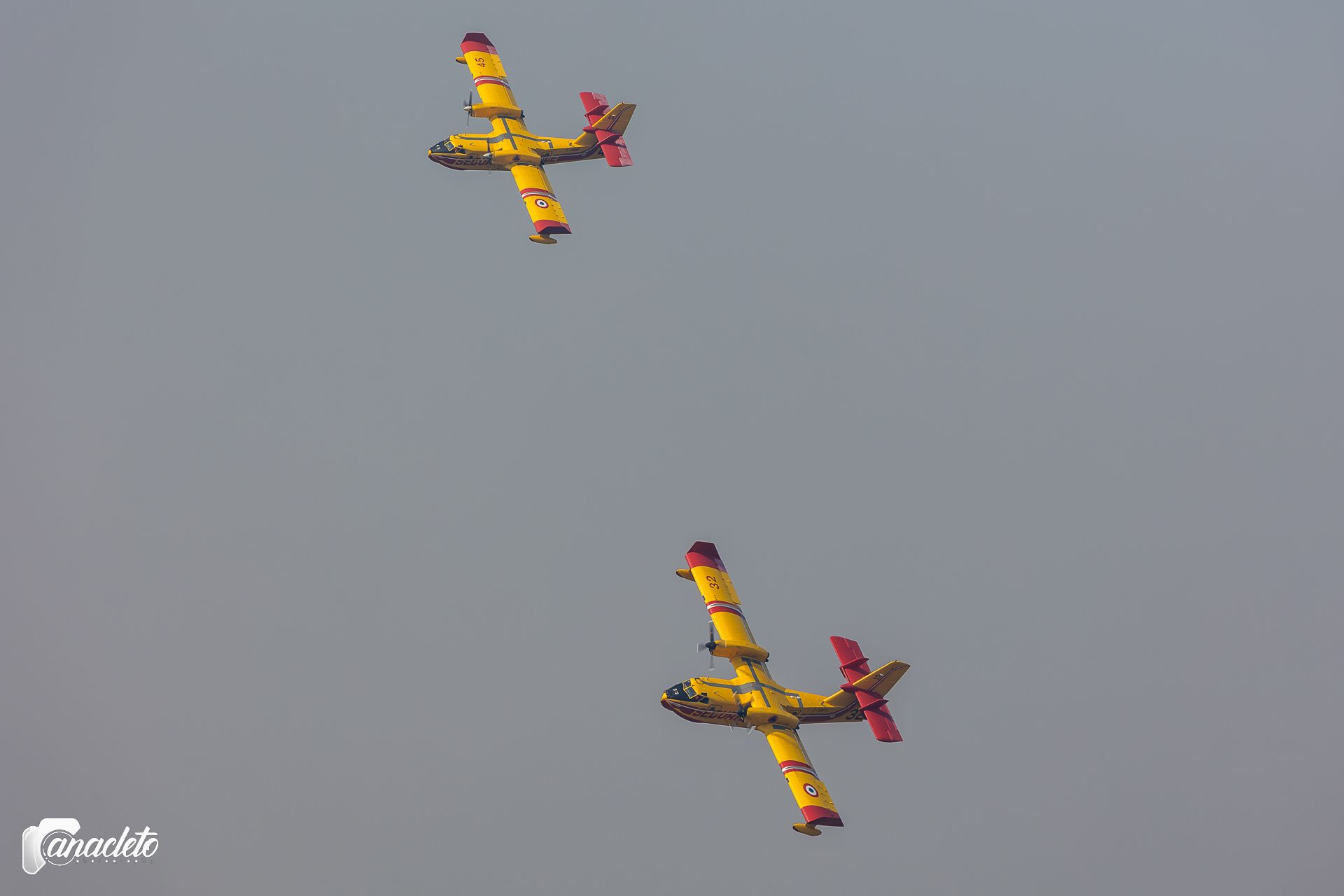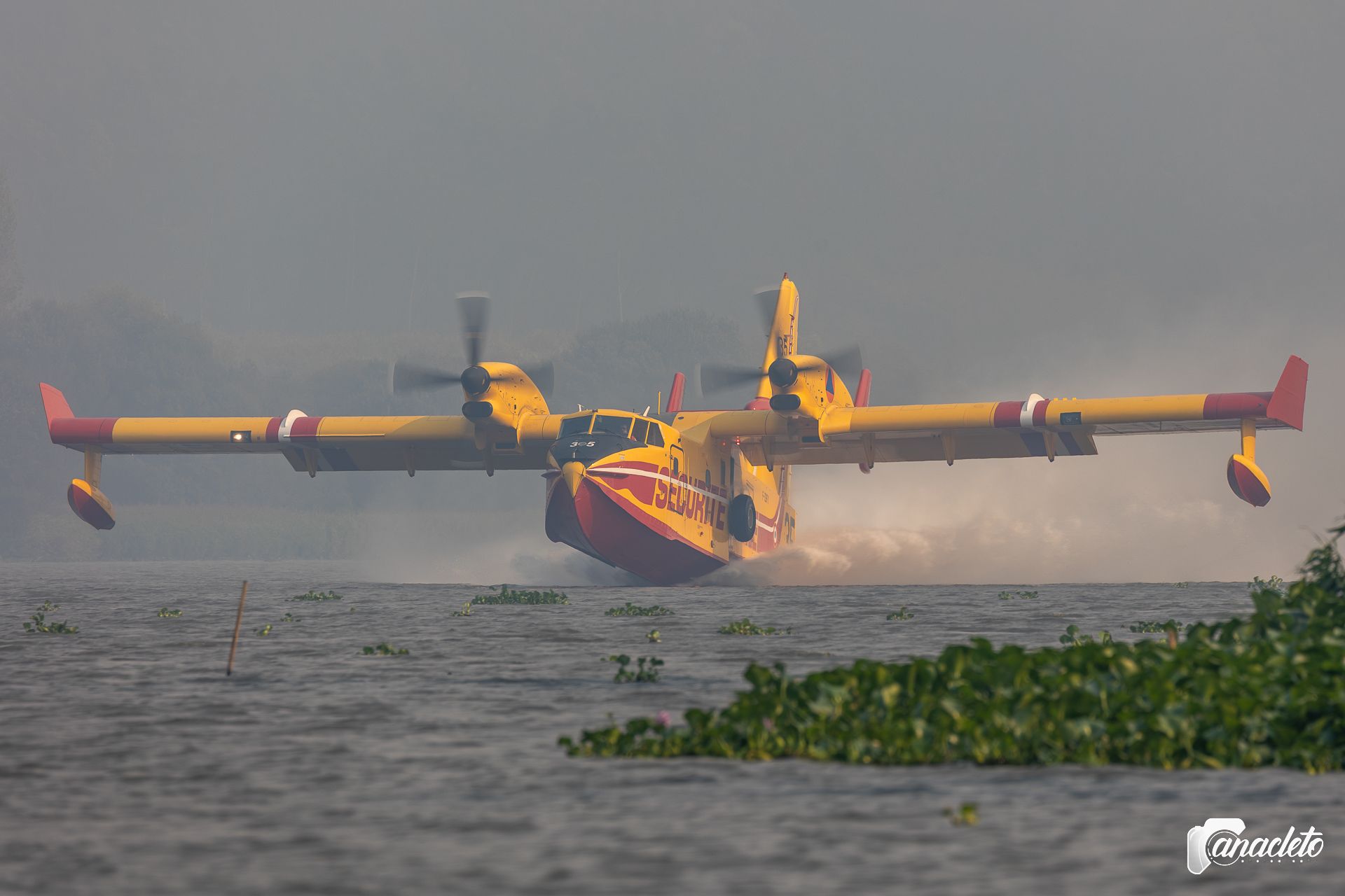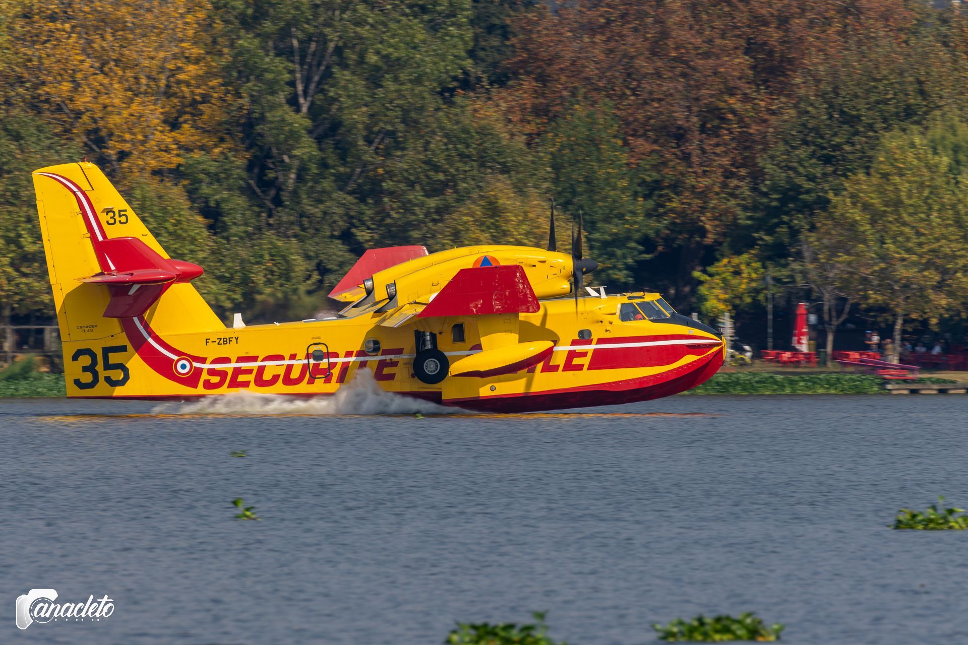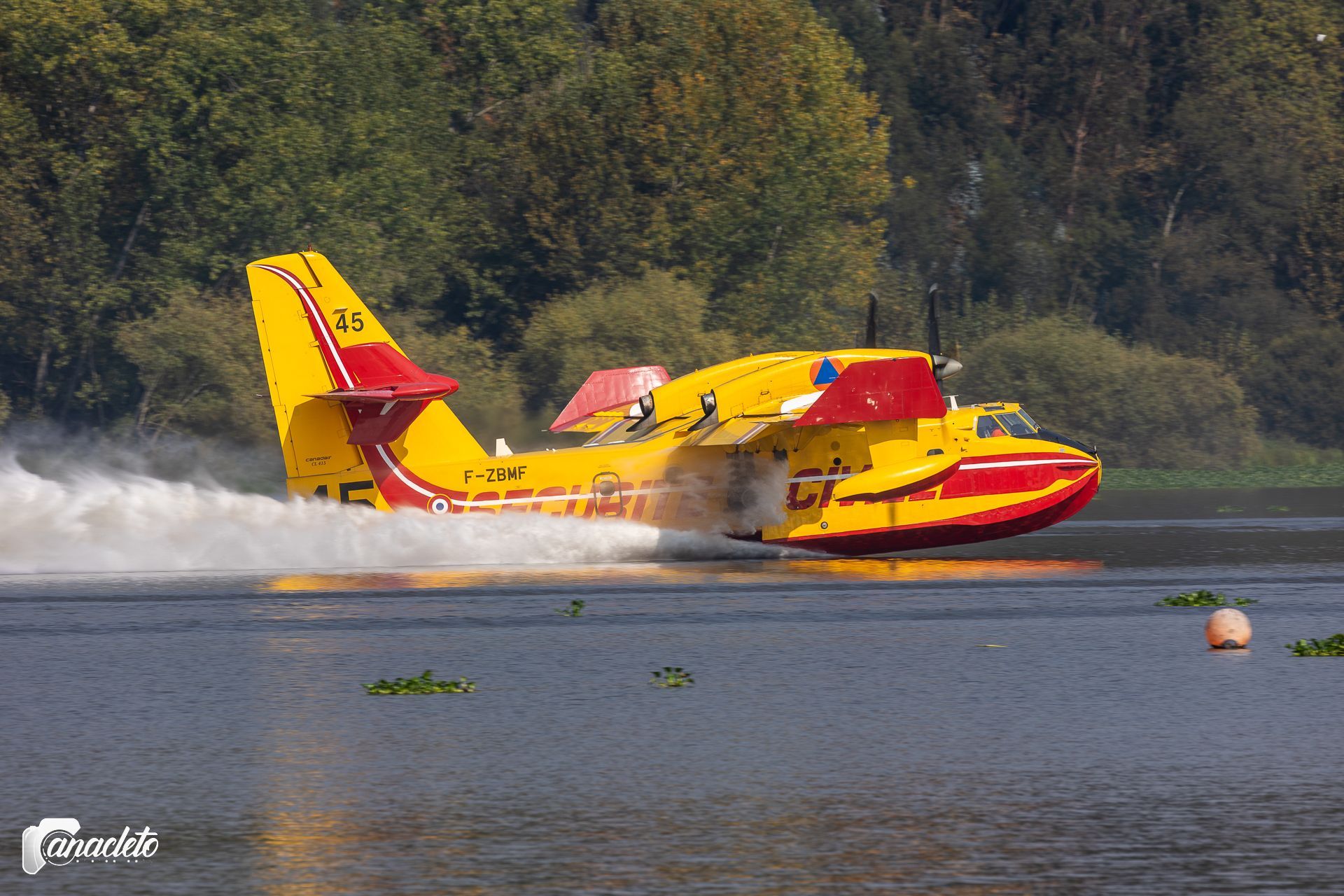 3 of the 4 Canadair CL-415s from Sécurité Civile performing the "scooping" maneuver at Pateira de Fermentelos. These aircraft were deployed in Portugal under the European Union's Civil Protection Mechanism.