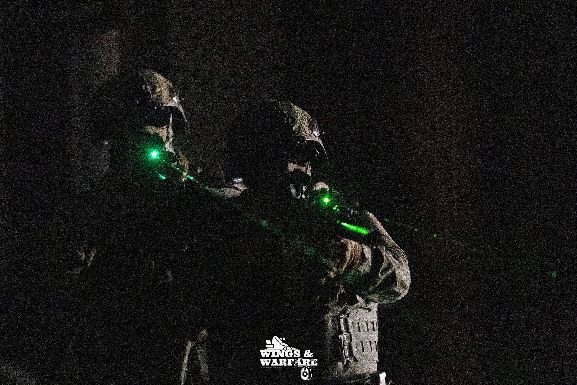 (In my most recent work with GIOE operatives, we captured the operational component in low-light conditions and the use of night vision goggles. In this scenario, with minimal light - only a faint glow from a large window far from my position - I had to increase the ISO to get the shot. For this photo, I used 1/800 sec, f/2.8, and ISO 64,000. In the following image, I applied 35% DeNoise AI in Adobe Lightroom Classic.)