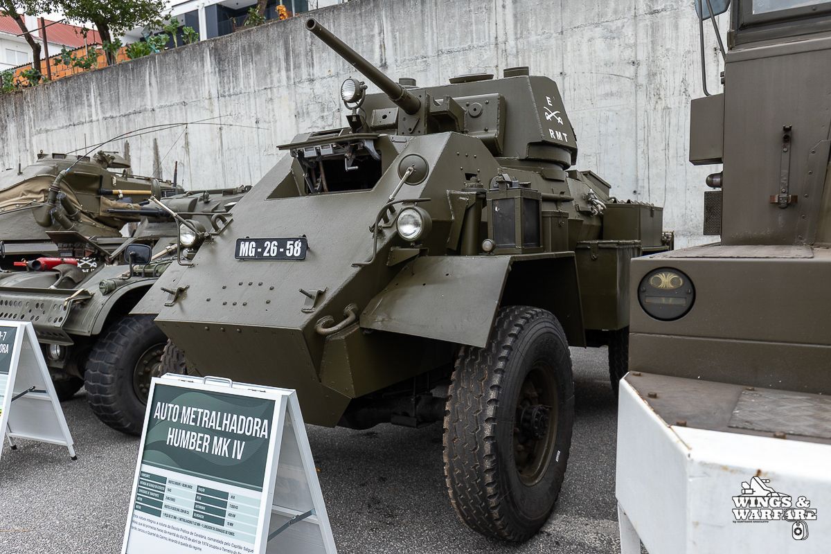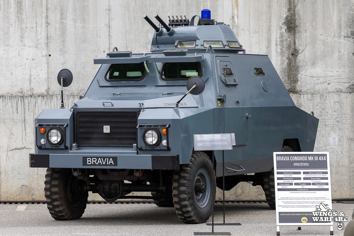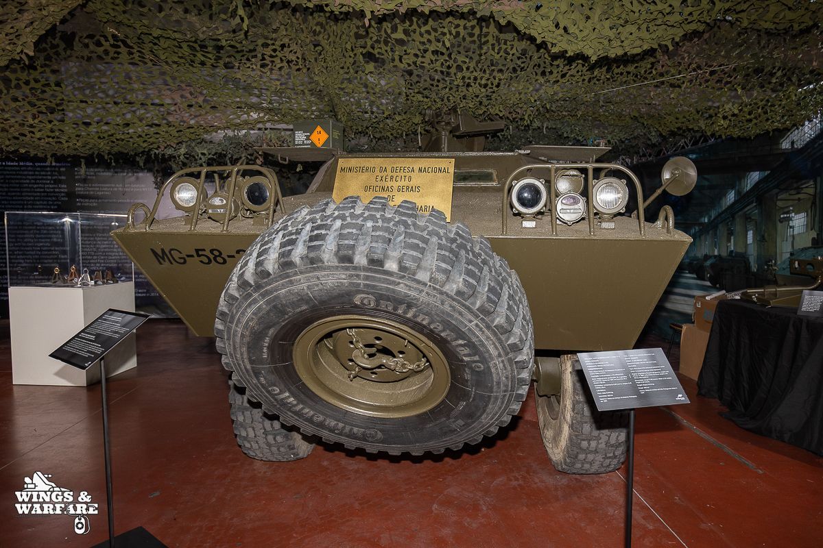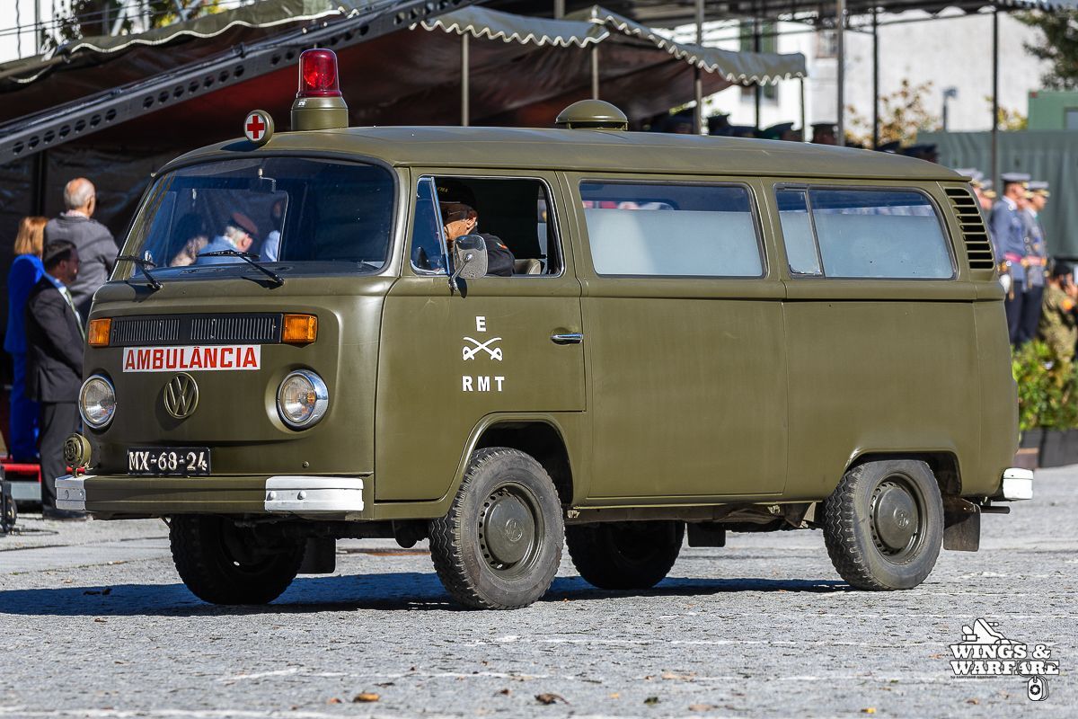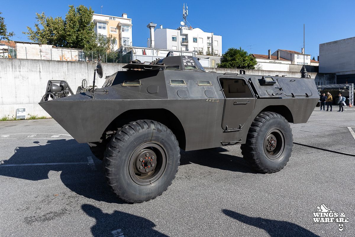 Among the models on display were the Panhard EBR 75, the Panhard AML HE60-7, the Humber Mk IV, and the Chaimite V200 “Bula”; the Berliet-Tramagal trucks; the Unimog S404; vehicles for transporting officers and members of the government, such as the Mercedes 280 SE, the Mercedes-Benz 220D, and the Citroën CX Limousine; the Bravia Comando Mk III; and the Volkswagen Type 2.