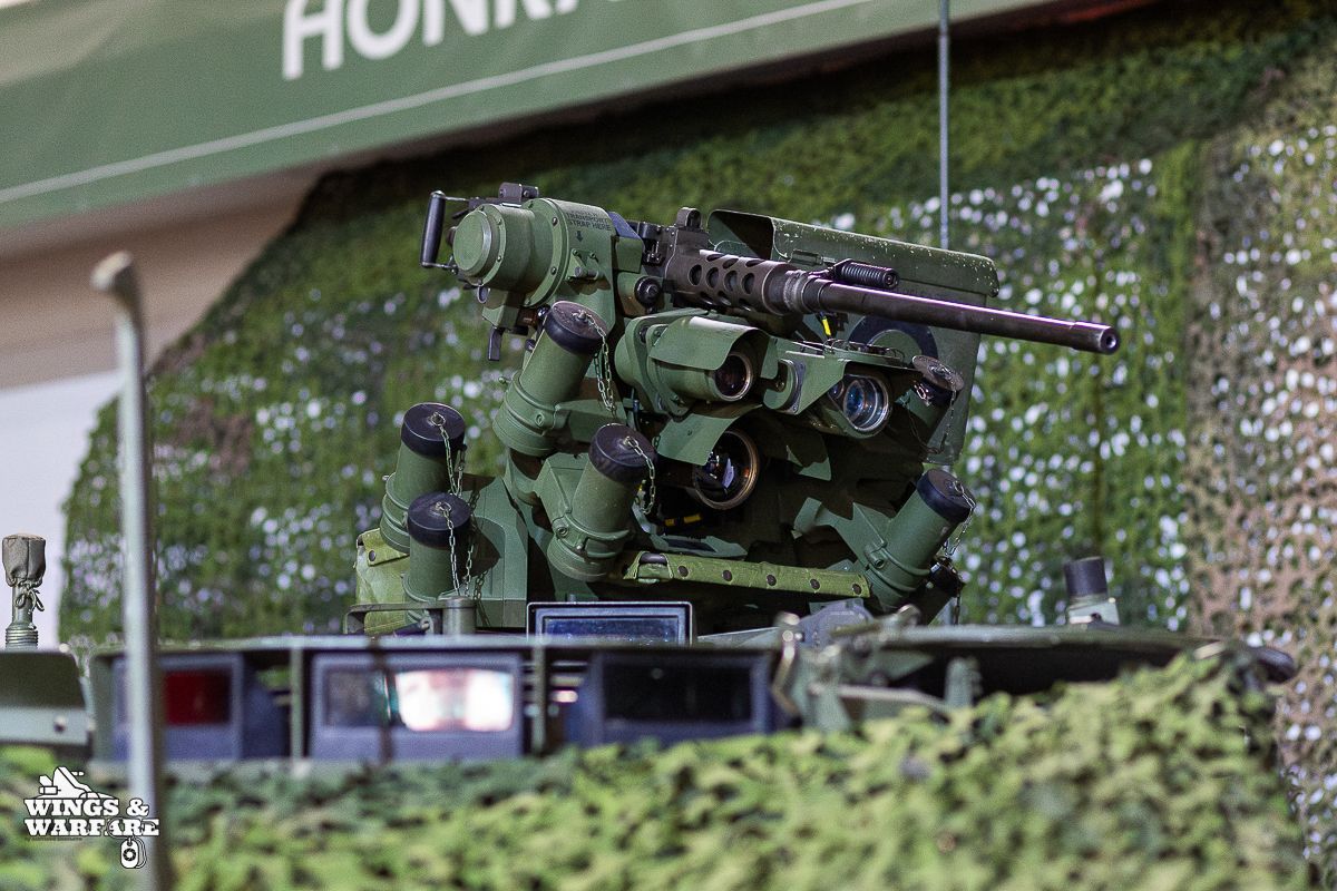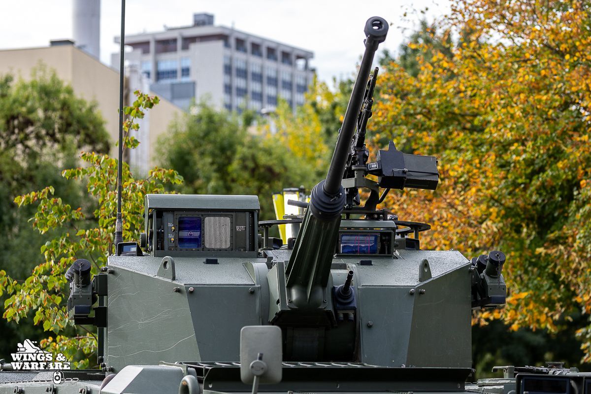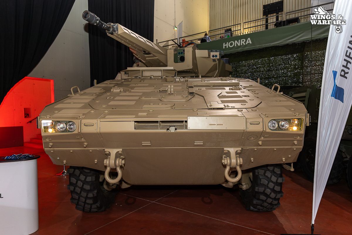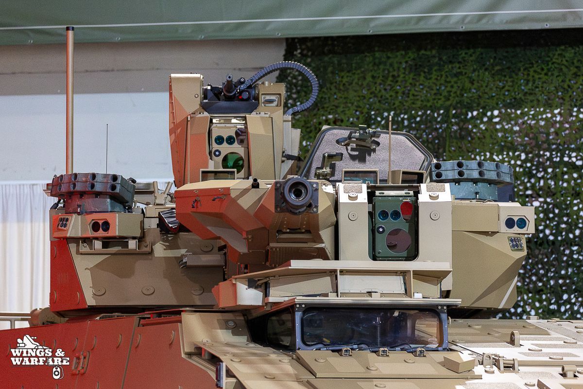 The fully stabilized Lance 2 turret integrates the Rheinmetall MK30-2/ABM (30 mm) cannon, capable of employing APFSDS-T armor-piercing ammunition and KETF Air Burst programmable ammunition, allowing effective engagement of entrenched infantry, drones, and low-altitude air targets up to 3,000 meters. The turret can also be equipped with a dual launcher for SPIKE LR/LR2 anti-tank missiles, expanding its combat envelope against armored vehicles.