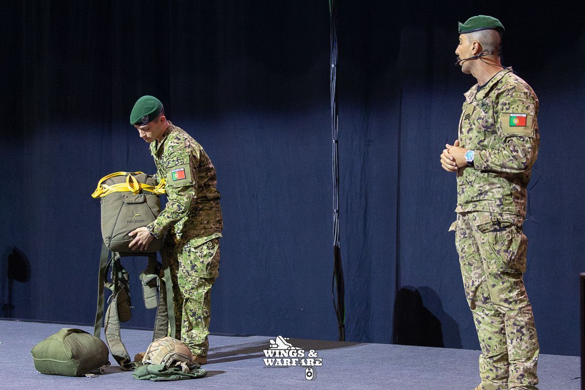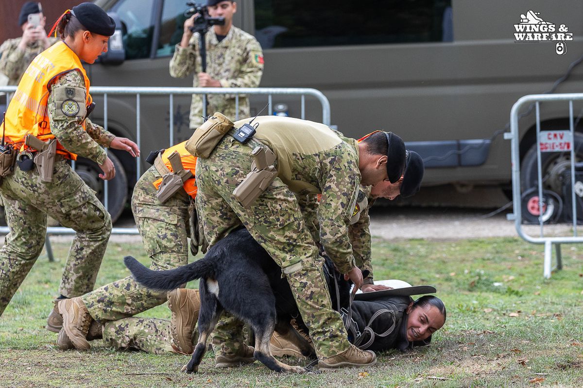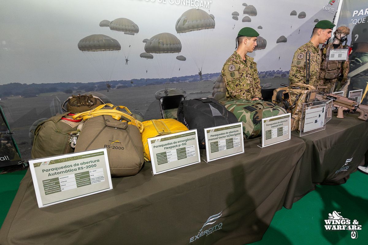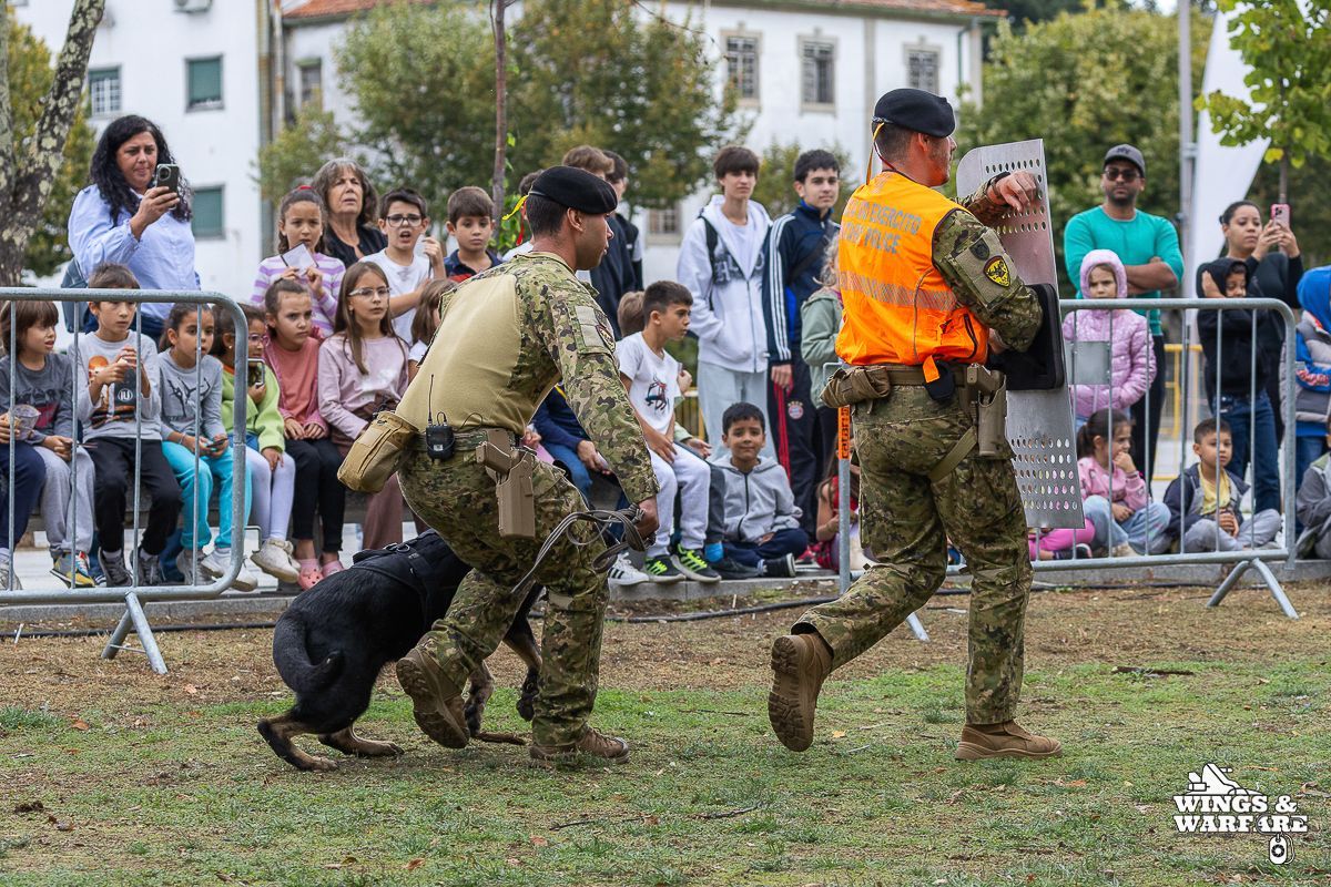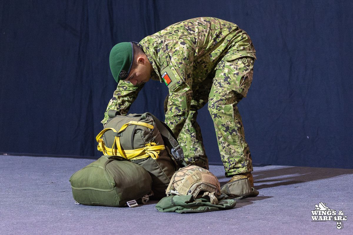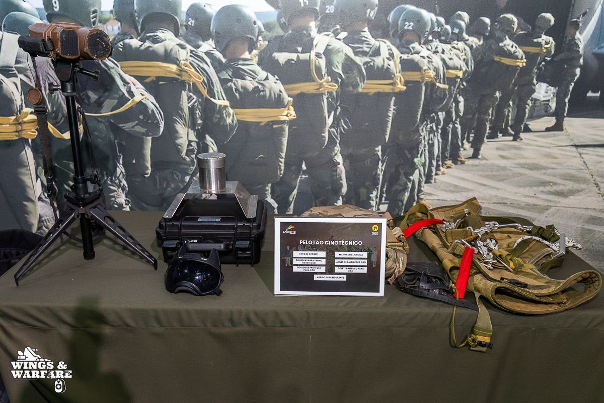 In terms of operational demonstrations, there were three distinct moments to watch. The first involved the deactivation of explosive devices/IEDs by soldiers from the 1st Engineering Regiment, demonstrating the entire process of identification, neutralization, and collection of evidence for further investigation. This was followed by a K-9 unit demonstration by the 2nd Lancers Regiment, highlighting the bond and coordination between the military-dog duo, culminating in a simulation of approaching a hostile and armed individual. Finally, the Paratroopers gave a practical presentation on how the automatic opening parachute is equipped.