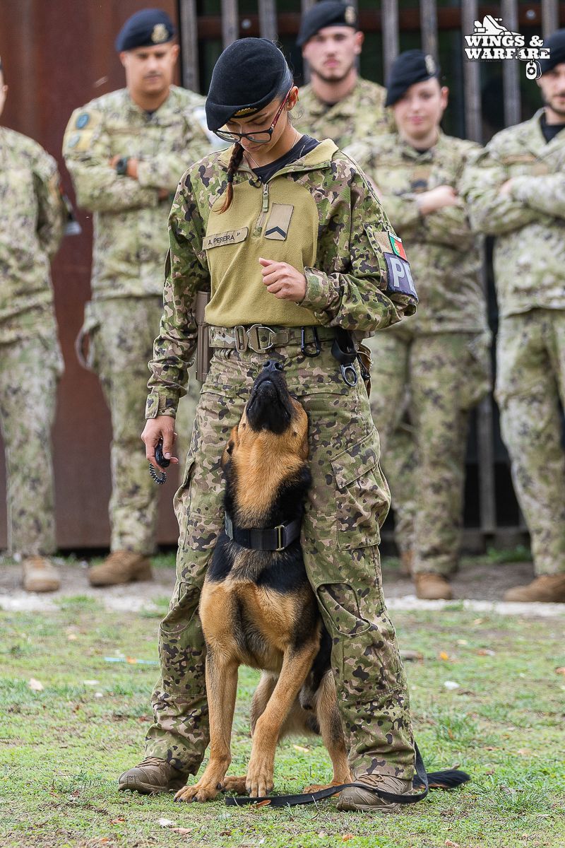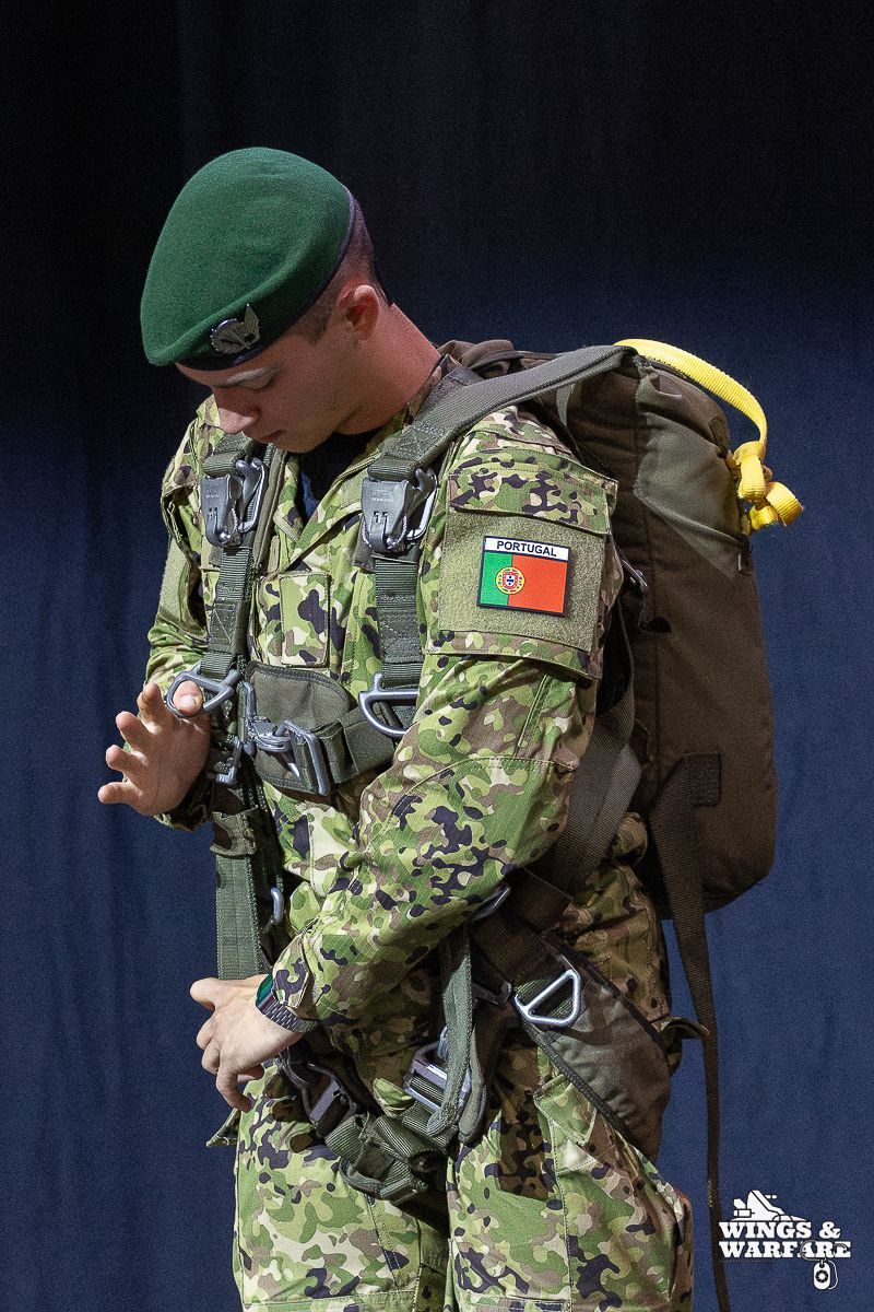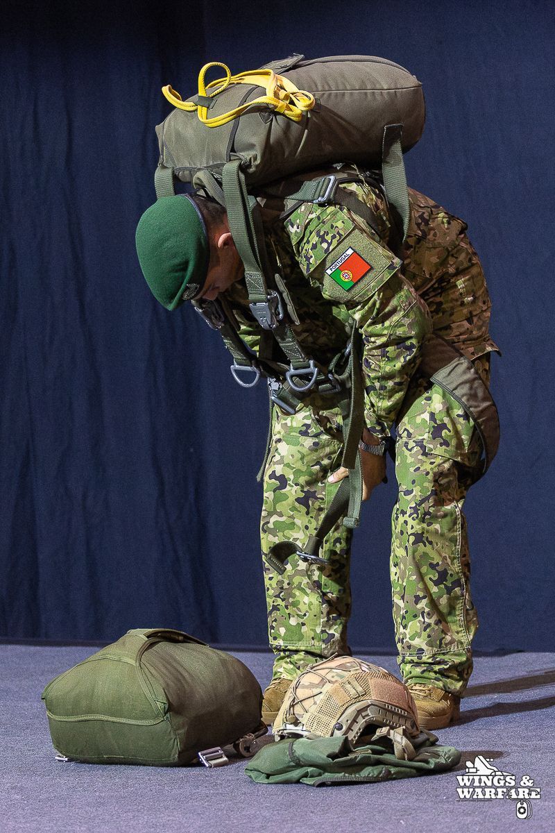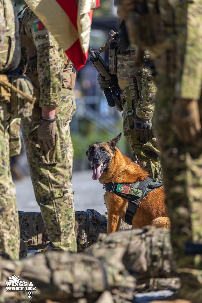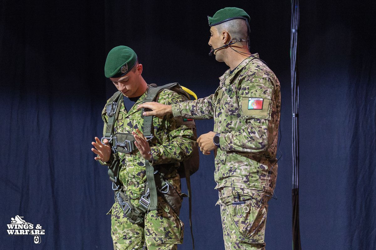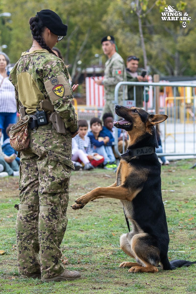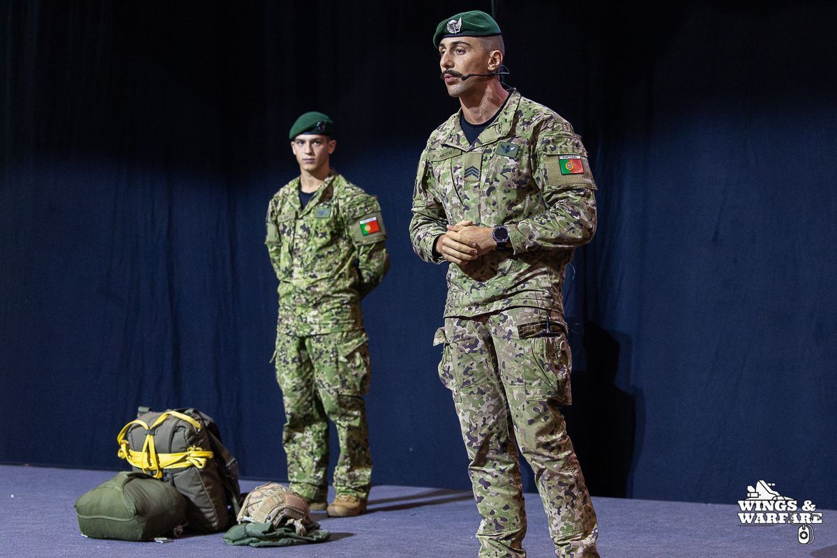 In terms of operational demonstrations, there were three distinct moments to watch. The first involved the deactivation of explosive devices/IEDs by soldiers from the 1st Engineering Regiment, demonstrating the entire process of identification, neutralization, and collection of evidence for further investigation. This was followed by a K-9 unit demonstration by the 2nd Lancers Regiment, highlighting the bond and coordination between the military-dog duo, culminating in a simulation of approaching a hostile and armed individual. Finally, the Paratroopers gave a practical presentation on how the automatic opening parachute is equipped.
