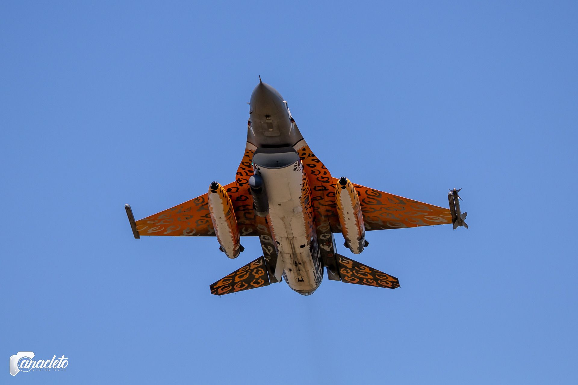 One of the F16 Fighting Falcons from 335 Mira, in this case, the one featuring the special Tiger Meet paint scheme.