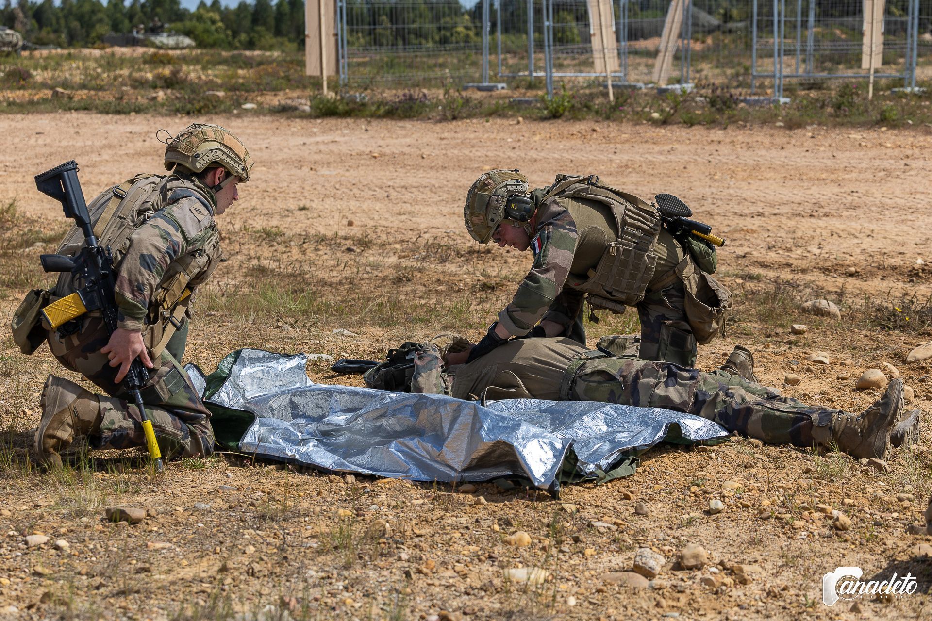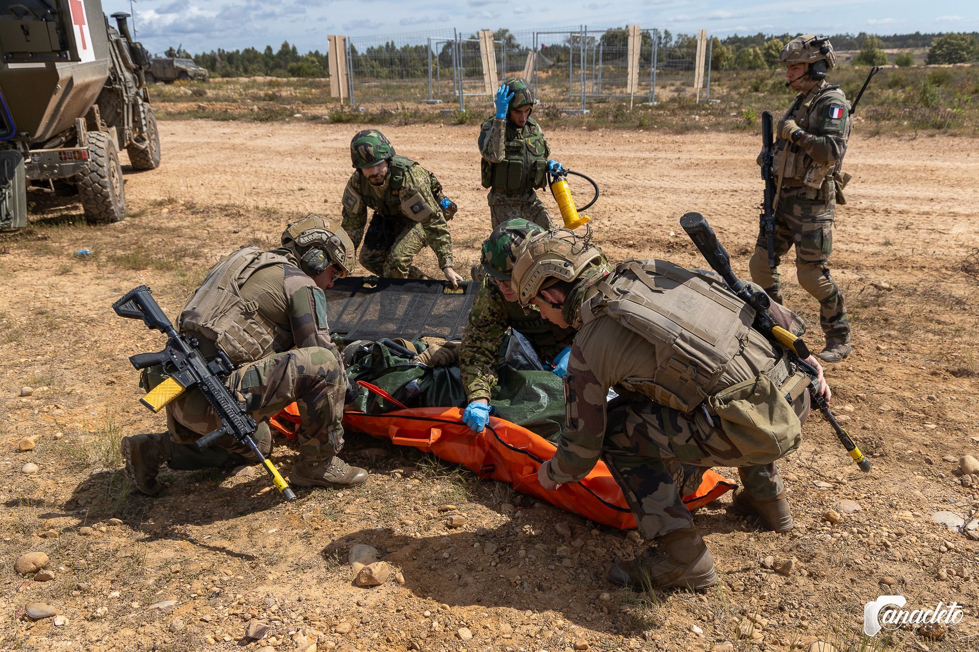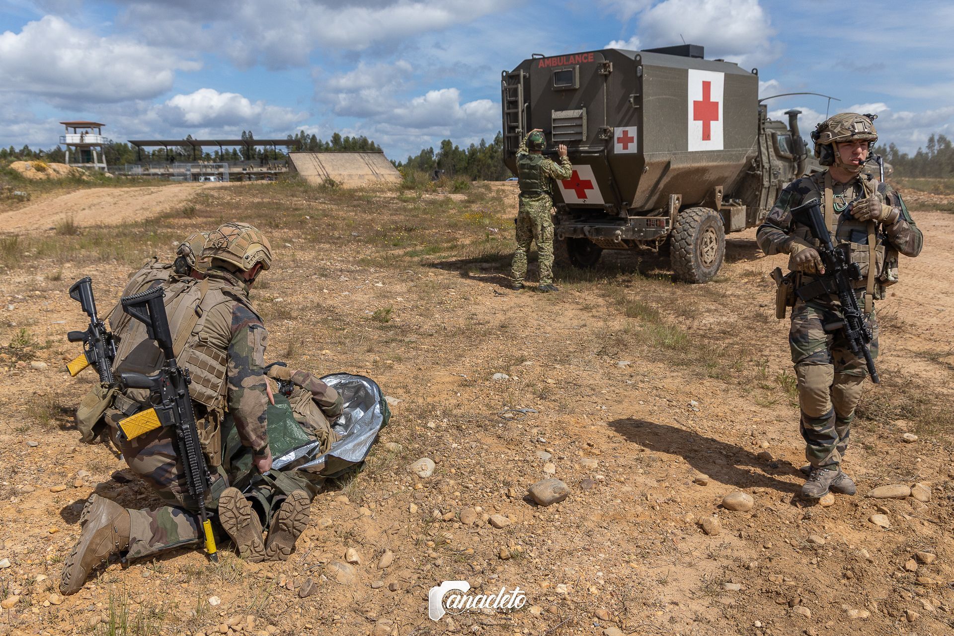 During the assault, a soldier from the French force is wounded. First aid is administered on the spot by his colleagues, but due to the extent of his injuries, he has to be extracted and transported to a medical unit. The Tactical Evacuation and Emergency Module is activated, and two VAMTAC vehicles are dispatched to the scene, one in ambulance configuration and the other in EMER (Emergency Medical and Resuscitation Team) configuration. The injured person, once stabilized, is transported to the rear so that he can be evacuated by helicopter. This evacuation (MEDEVAC) was carried out by the EH-101.