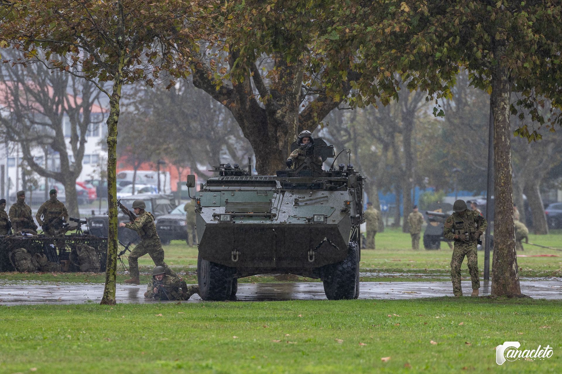 After an attack on one of the Pandur II 8x8 ICV armored vehicles, the soldiers inside leave, creating a security perimeter and launching smoke grenades, in order to create cover for the affected vehicle. The remaining Pandur II in the column move to flanking positions, in order to surround the hostile forces while their teams advance on the position, eliminating the shooters. After ensuring the safety conditions of the location, the teams regroup and board the vehicles again, continuing with their mission.