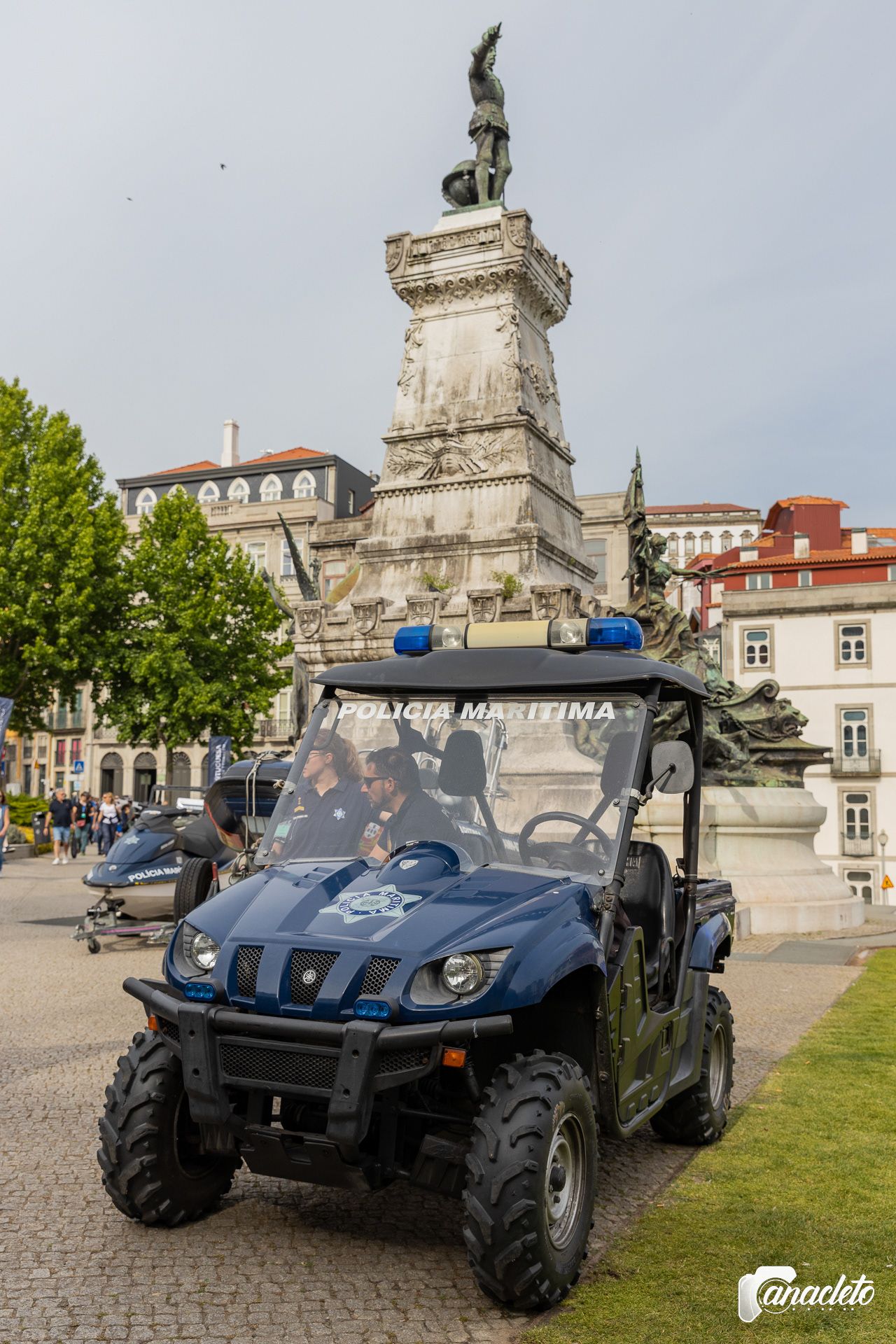 At Parque do Infante D.Pedro, it was possible to see some light land and naval assets that represent the Navy's rapid mobility, such as the Yamaha Rhino buggy, a semi-rigid boat and watercraft from the Maritime Police and a 4x4 Polaris buggy and motorbike belonging to the Marines.