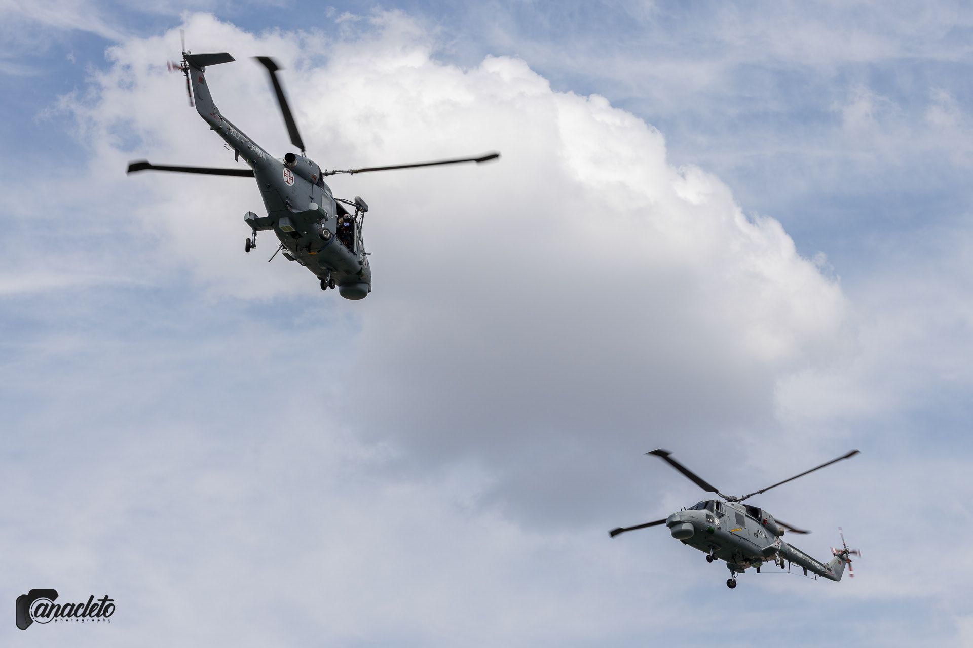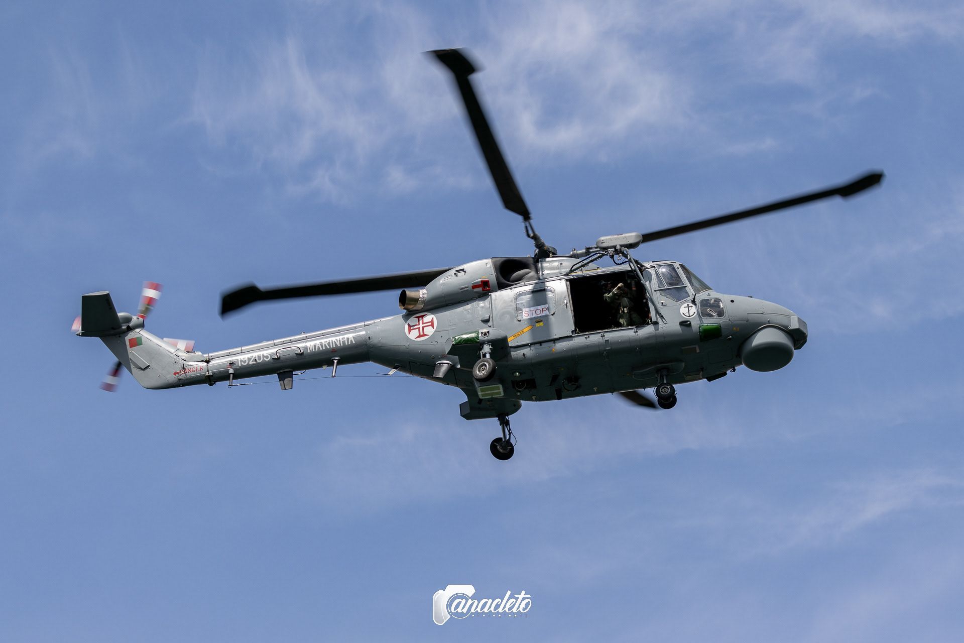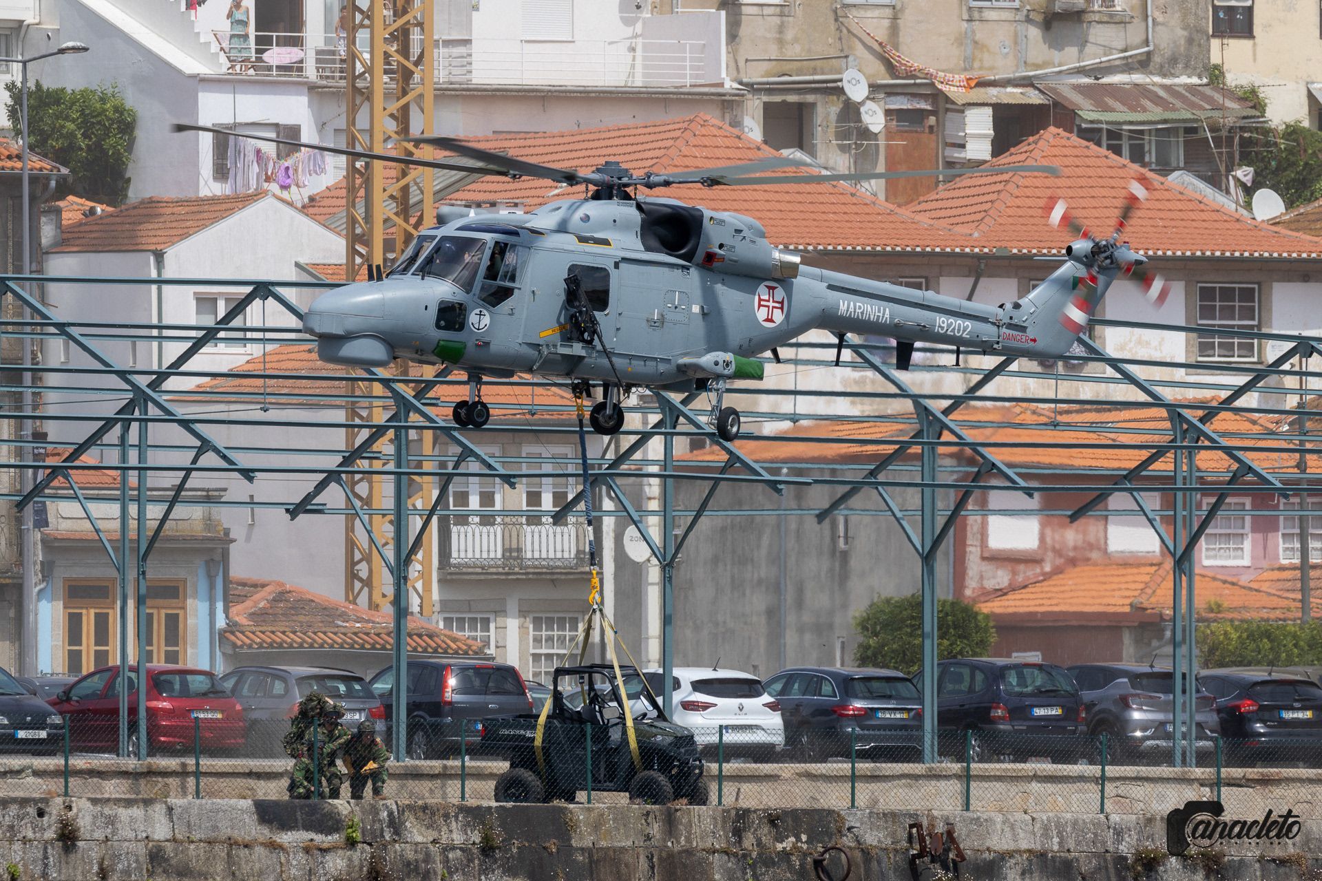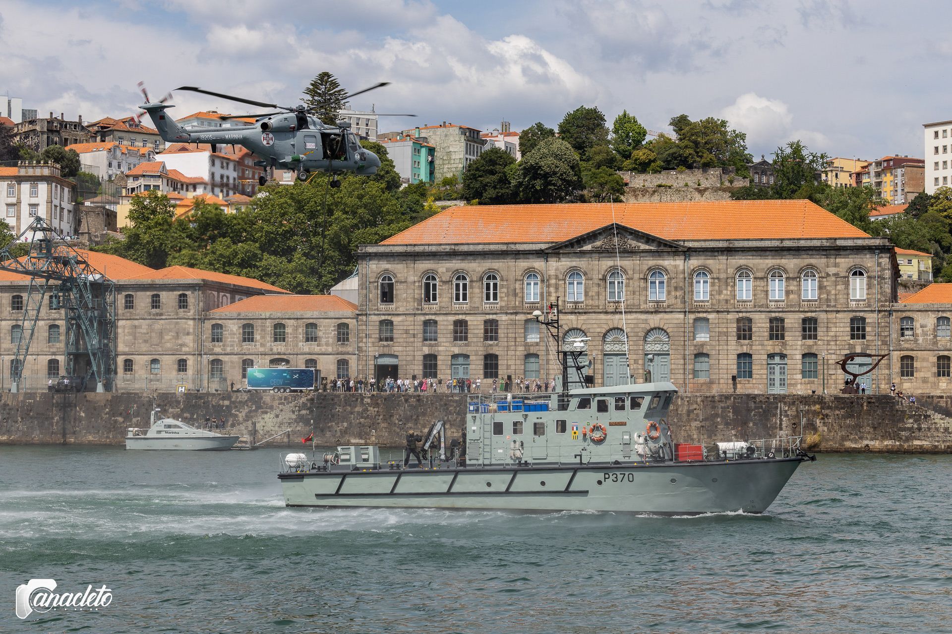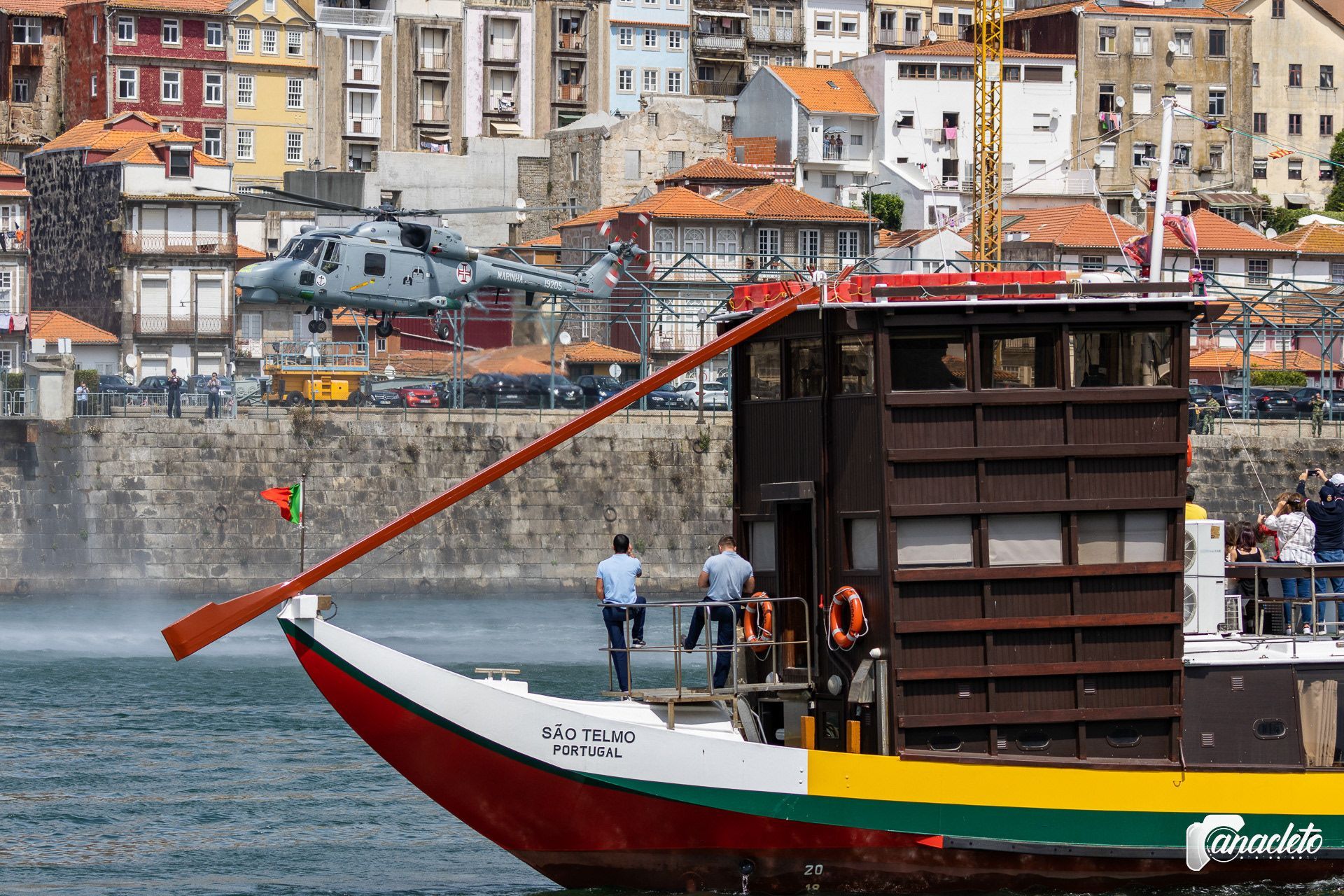 At the end of the demonstration, two Lynx Mk95 perform a small aerial display, ending with a salute to the tribune and audience present and the many small watercrafts used on the demonstration paraded in front of the old building of Alfândega do Porto.