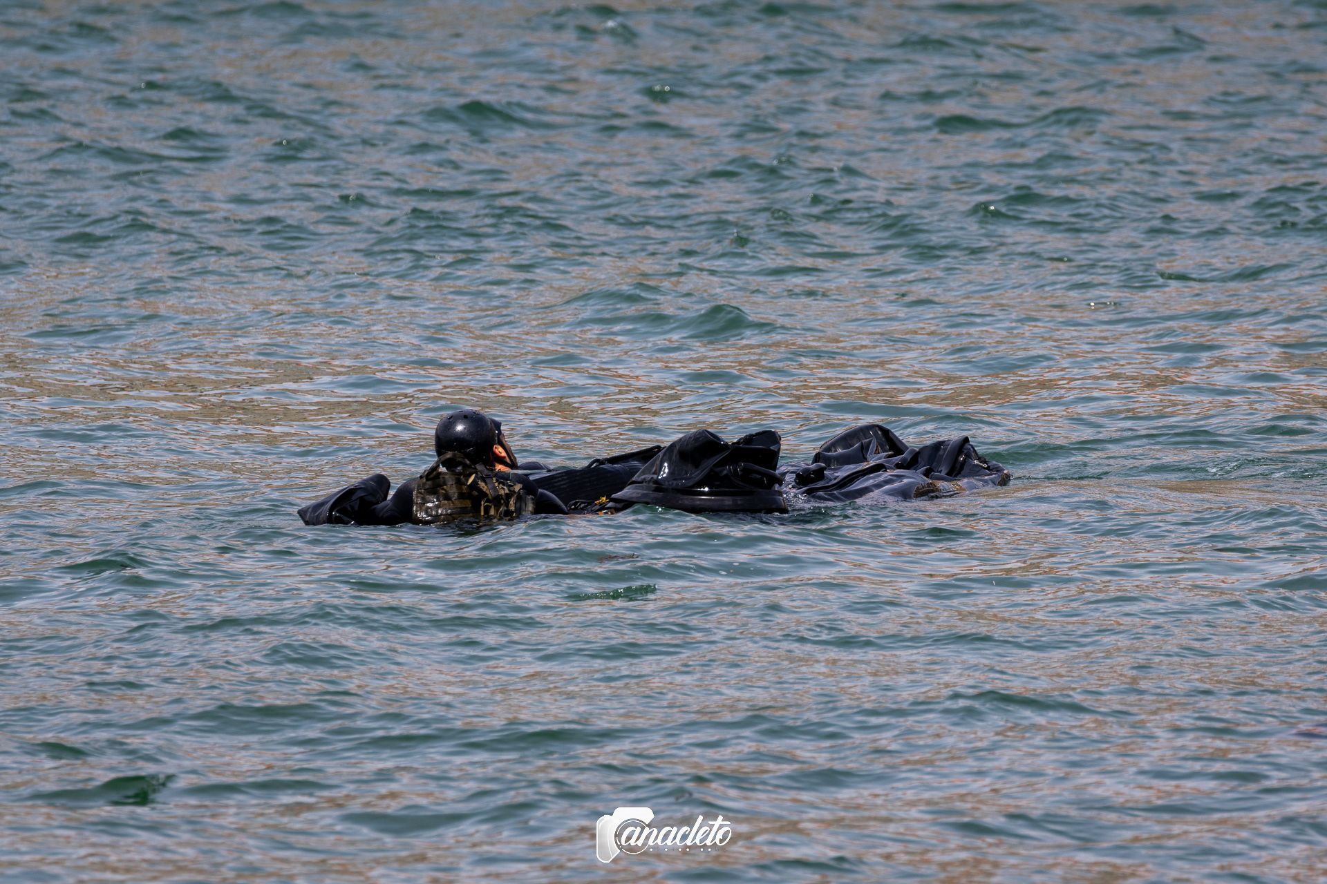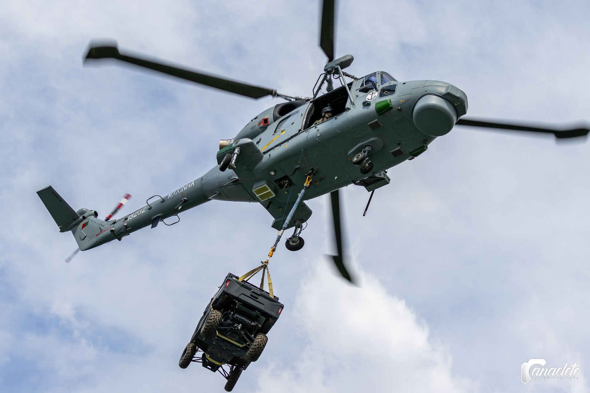 2nd Activity: Marines simulate an infiltration into hostile territory, using the Lynx Mk95 helicopter, where they initially launch inflatable boats and later jump from the helicopter that hovers at a low altitude. After this, the Marines prepare the vessel and proceed with the assault. In order to support this force, other soldiers are quickly equipped with a 4x4 Polaris buggy, using the suspended load capacity of the Lynx. This allows a quick response from these forces.